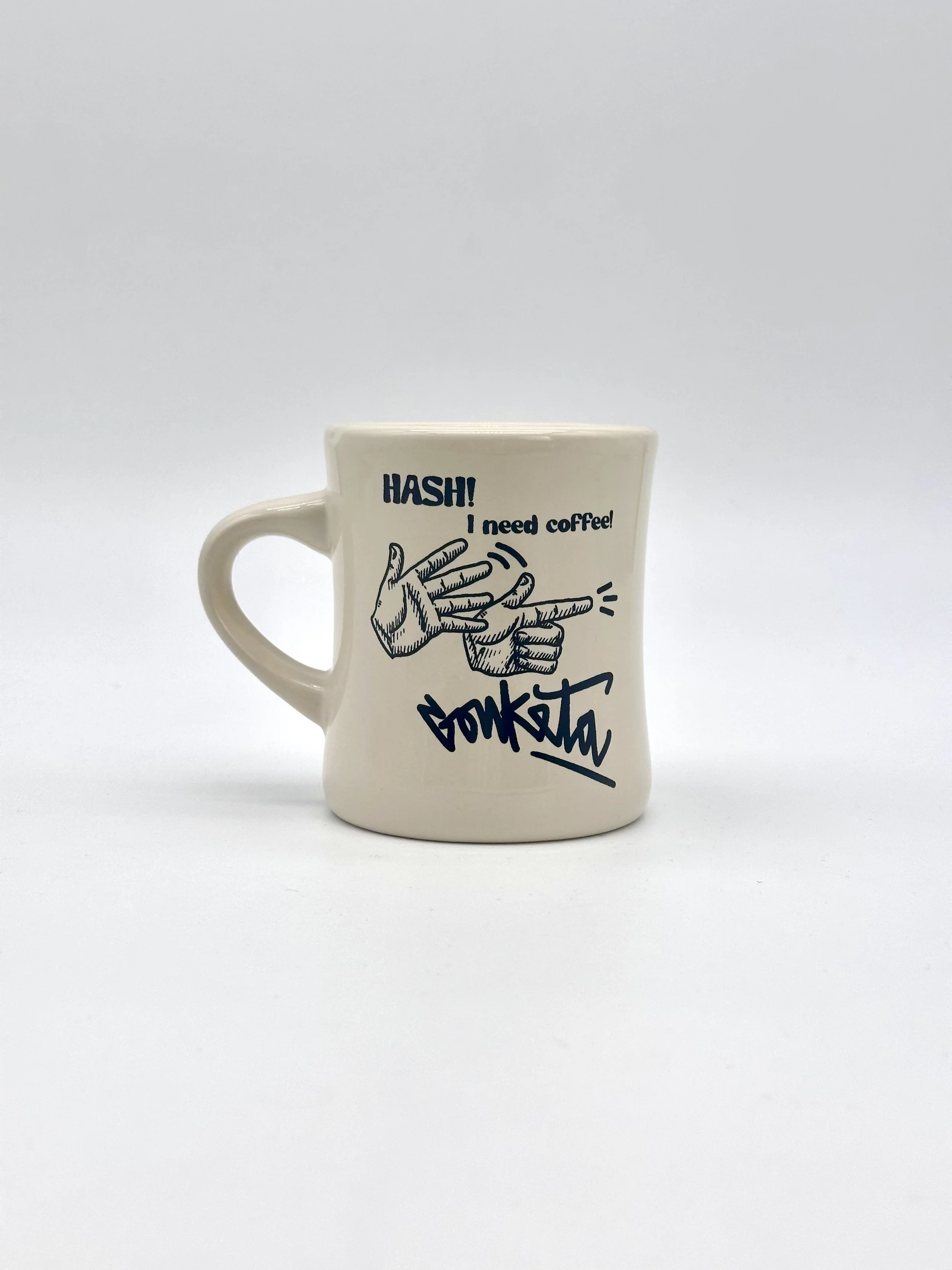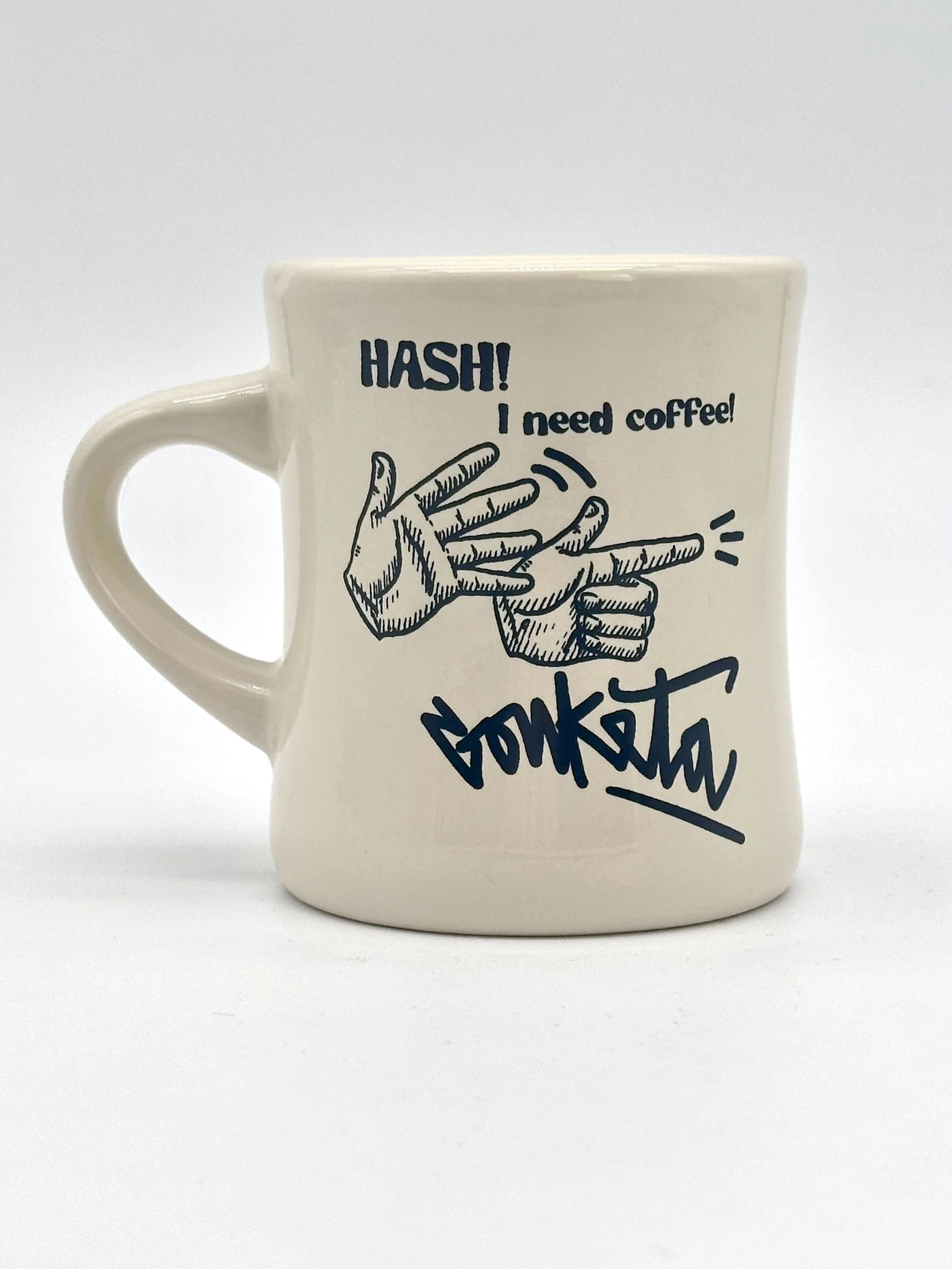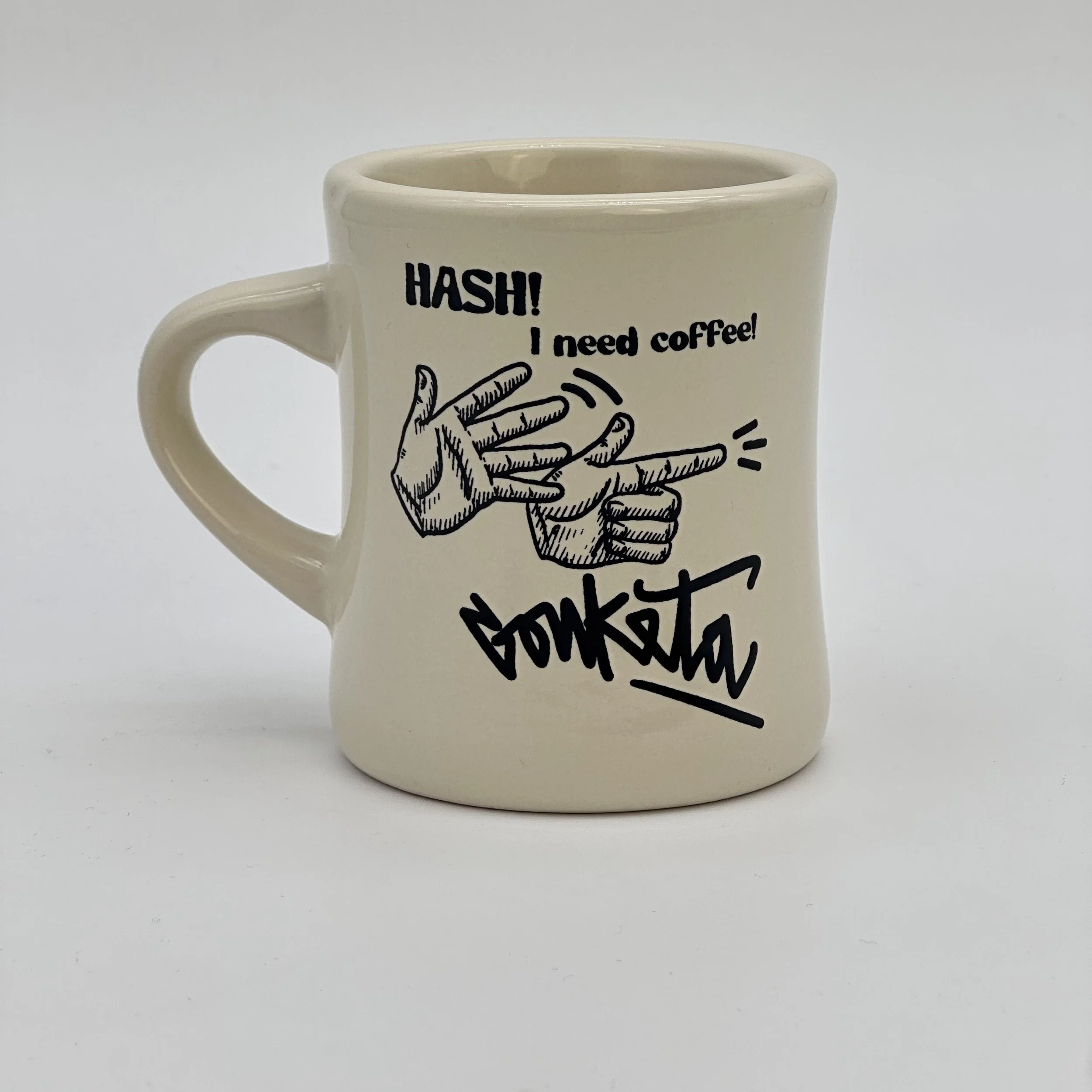 Custom diner mug in off-white with cool art on one side. 325ml.